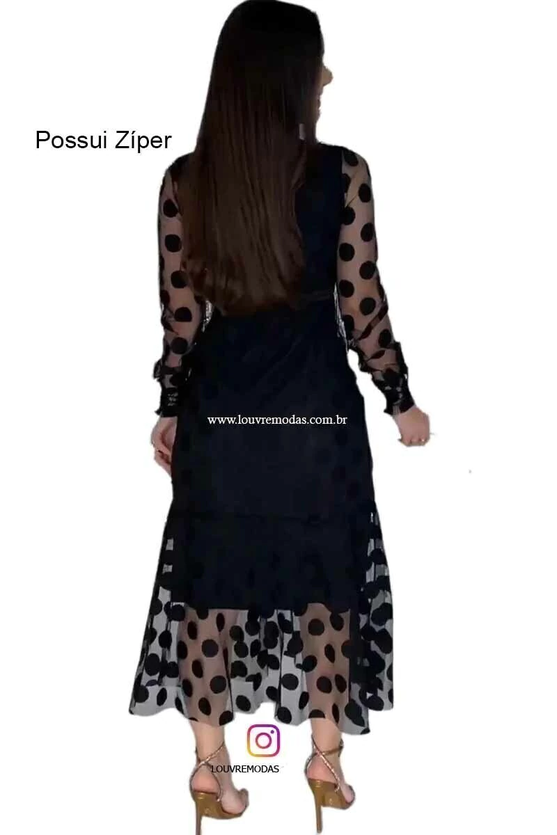 Vestido Ana Julia Tule Preto Midi com Detalhes em Guipir